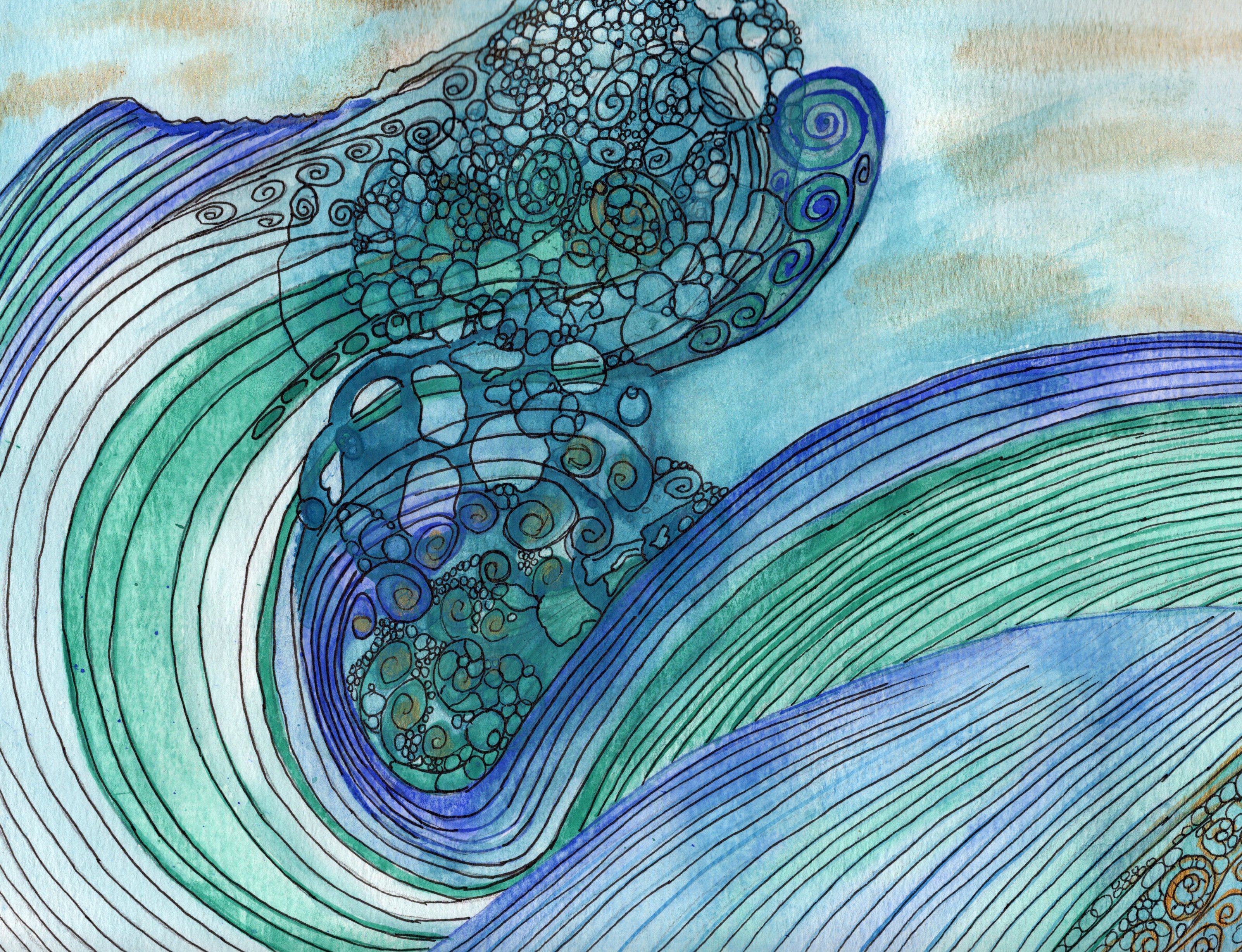 Cosmic Ocean Flow Series, Wavy - Original Watercolor/Pen/goldleaf 8.5x11